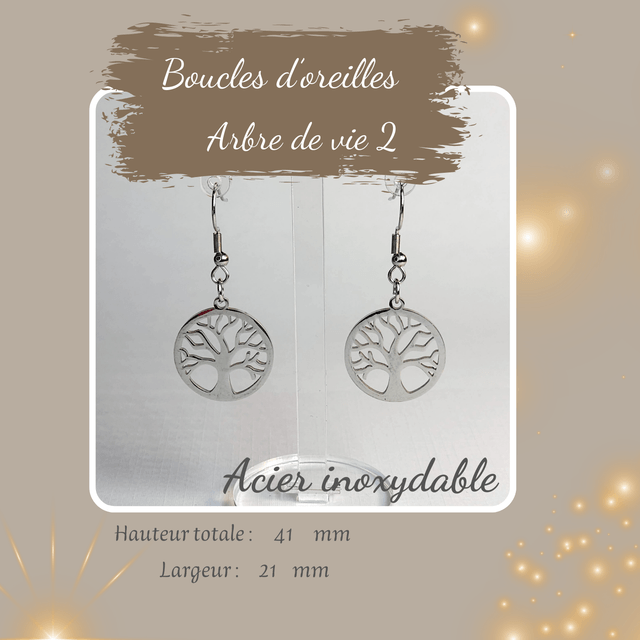 Boucles d'oreilles en acier inoxydable couleur argent, Thème Arbre de vie.