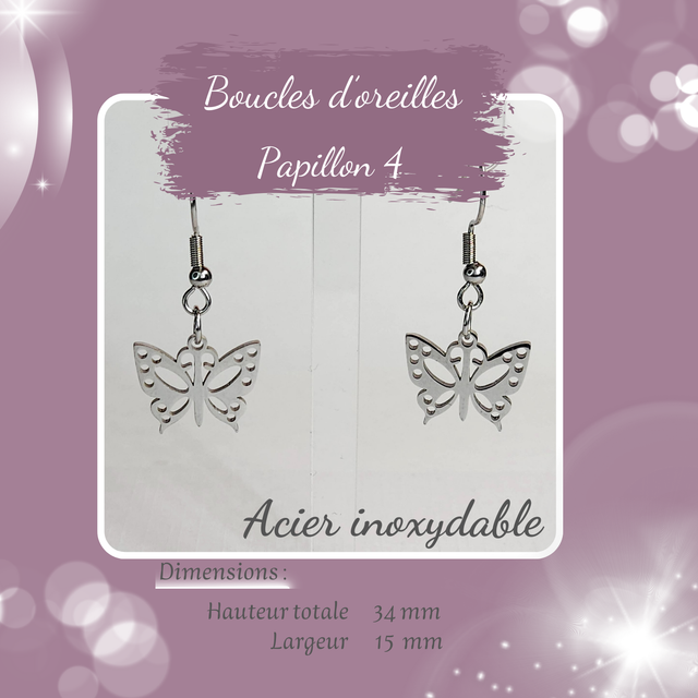 Boucles d'oreilles Papillon en acier inoxydable couleur argent.